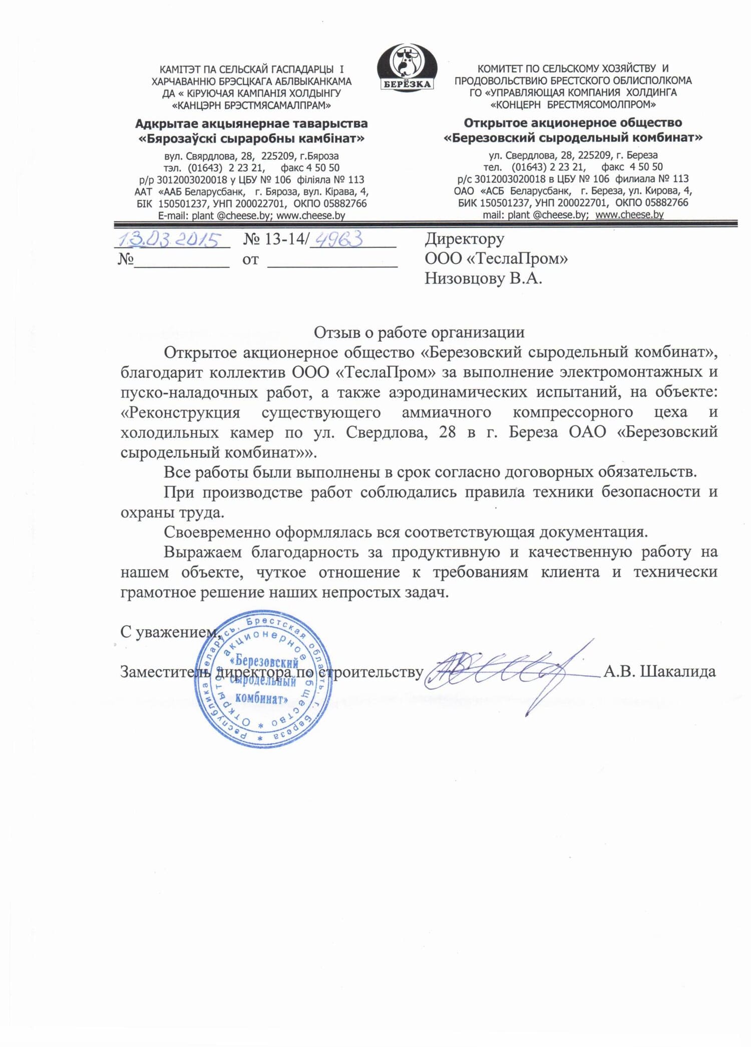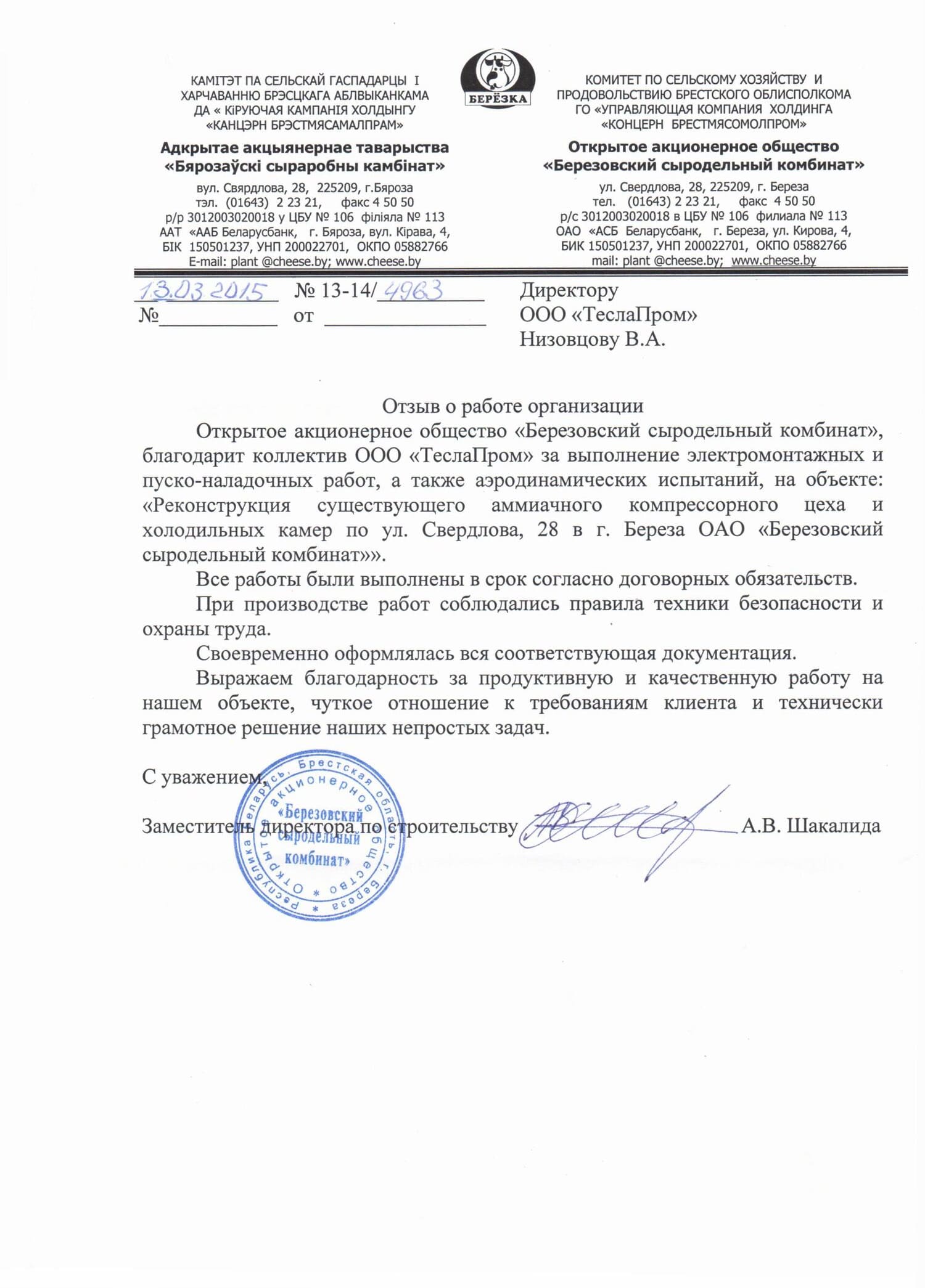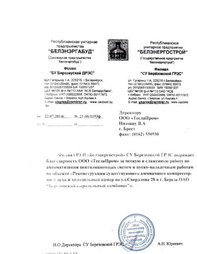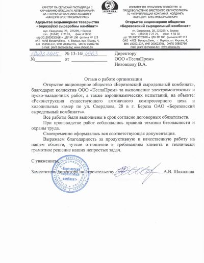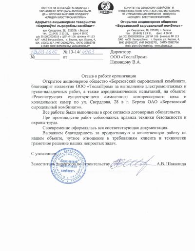 - Реконструкция существующего аммиачного компрессорного цеха и холодильных камер по ул. Свердлова 28 в г. Береза ОАО «Березовский сыродельный комбинат»;