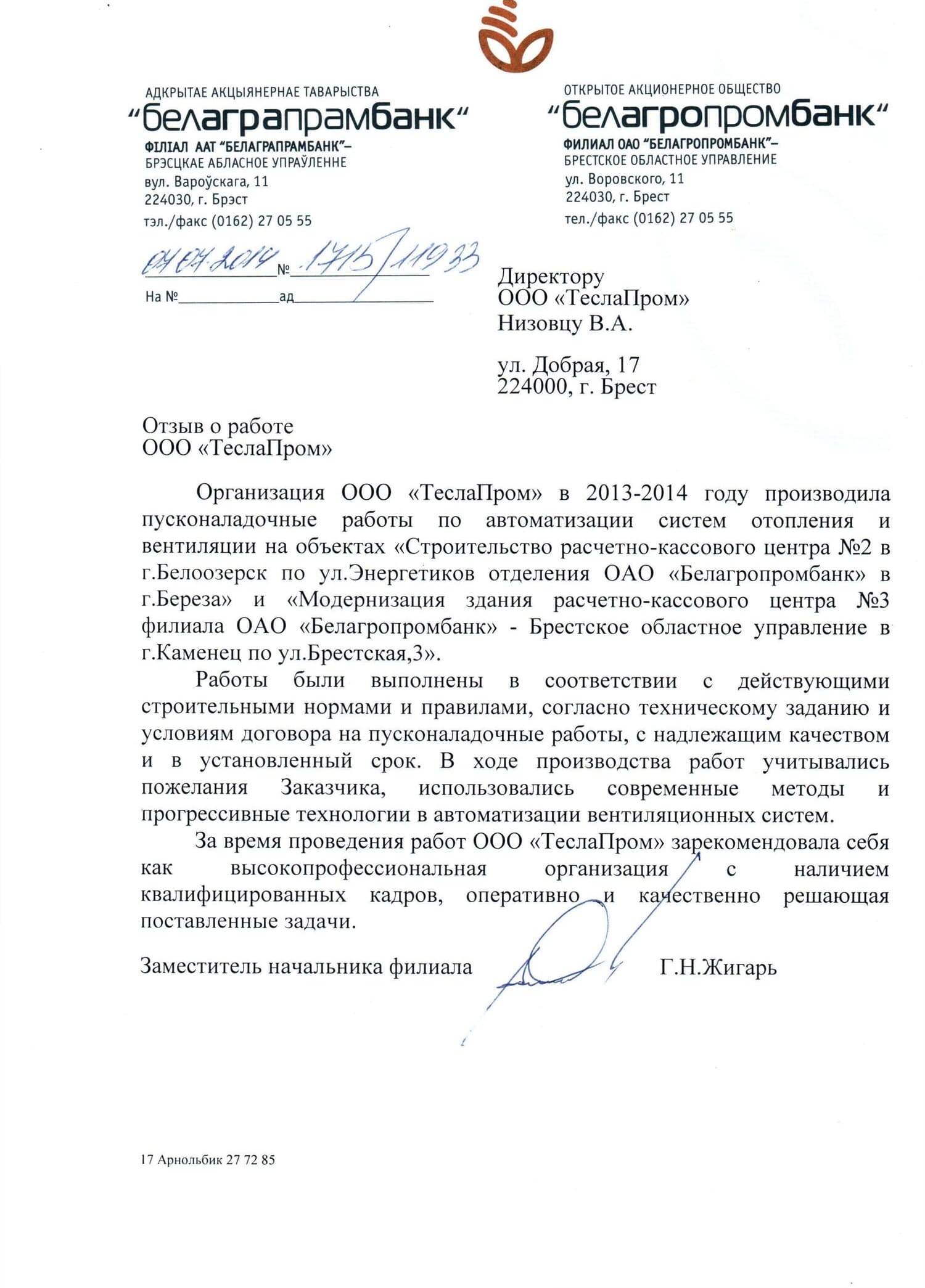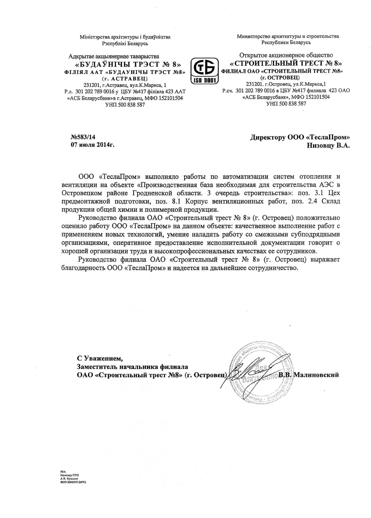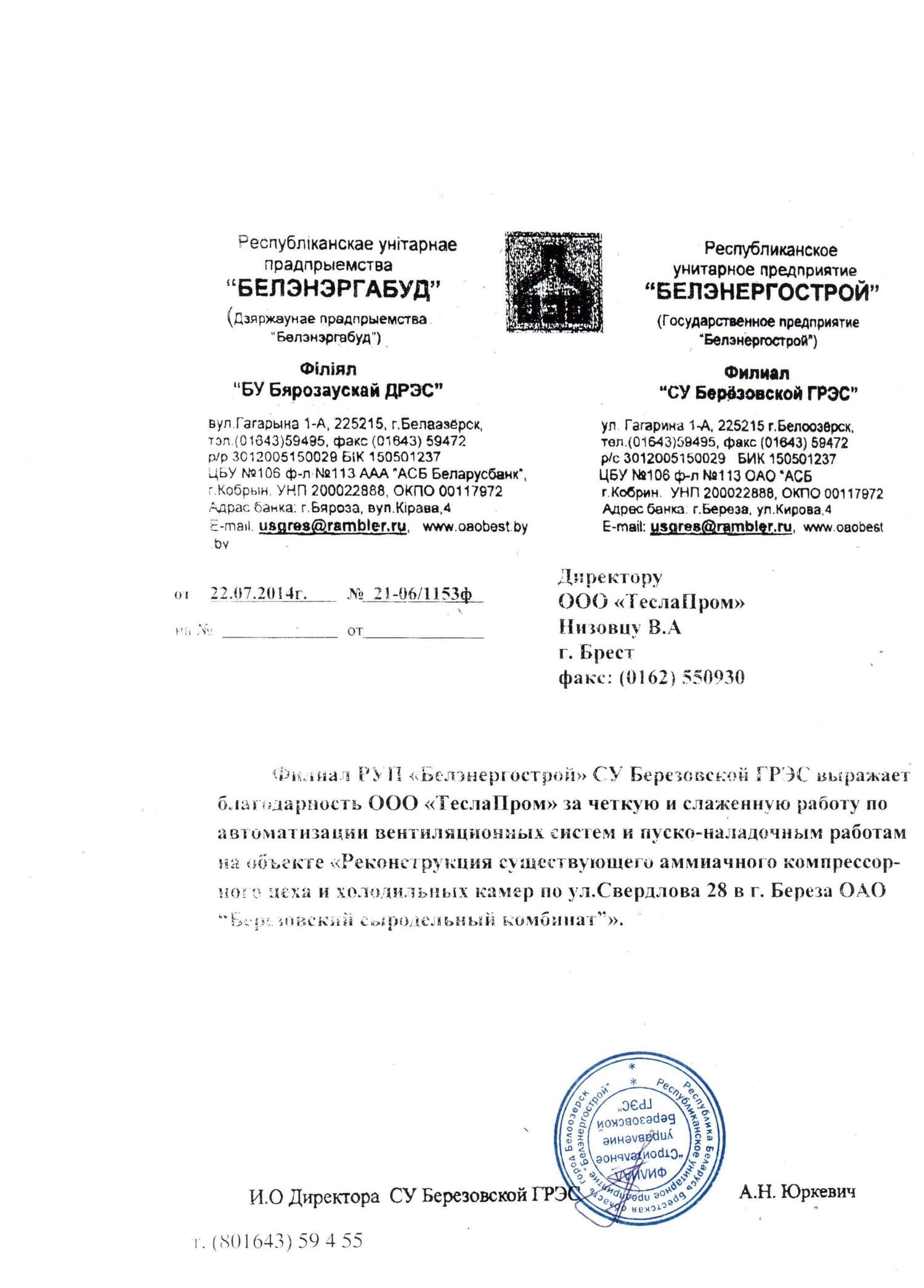 - Реконструкция существующего аммиачного компрессорного цеха и холодильных камер по ул. Свердлова 28 в г. Береза ОАО «Березовский сыродельный комбинат»;