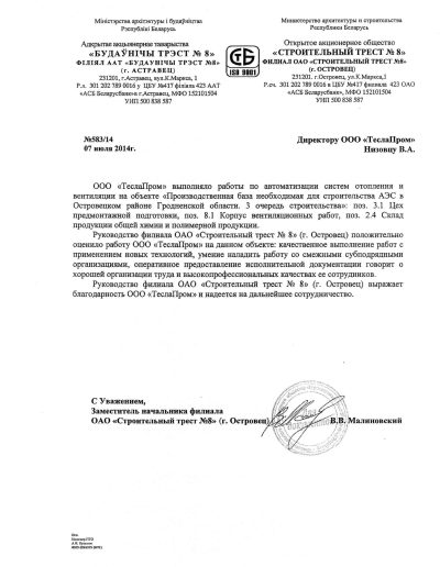 Имеем необходимые разрешения, аттестаты соответствия для выполнения общестроительных, электромонтажных работ, сертификат соответствия на разработку систем автоматического управления под технические условия заказчика, аккредитованную измерительную лабораторию.